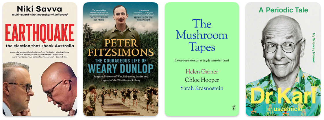 The Mushroom Tapes by Helen Garner, Chloe Hooper & Sarah Krasnostein Three of Australia's finest writers came together to witness the trial that gripped the nation—the Leongatha mushroom murders case. Their conversations about Erin Patterson's trial explore love, jealousy, mycology, and our collective obsession with true crime. This isn't just another true-crime book; it's a fascinating examination of how we consume and process real-life tragedy.